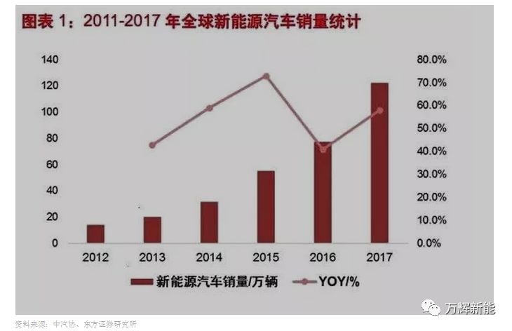 2012年以来,国内外新能源汽车的产销量持续高速增长,近五年来复合增速达到54%。