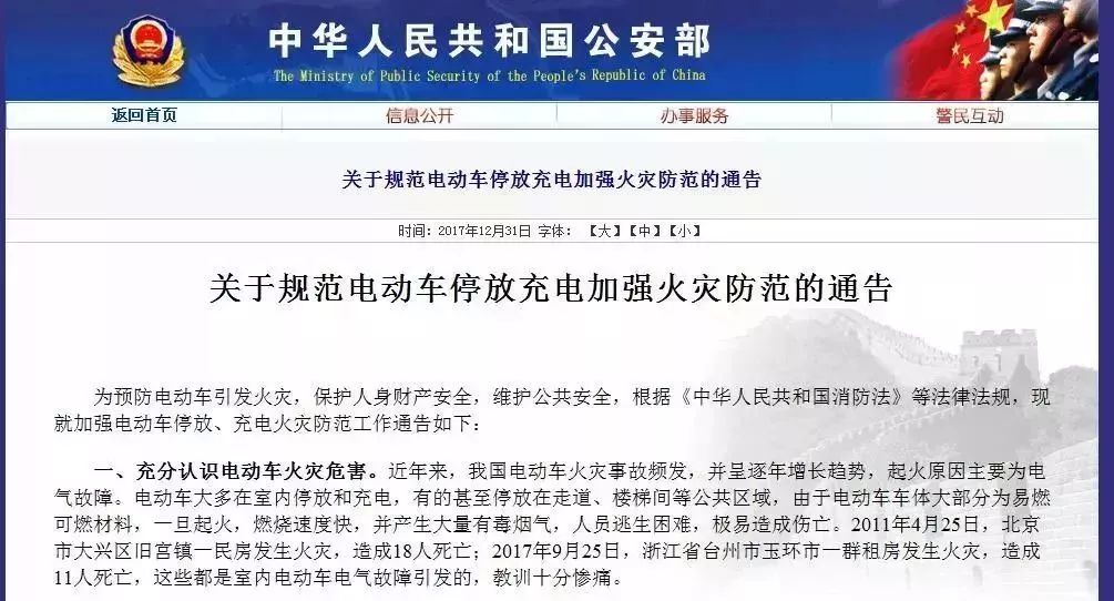 2017年12月31日,公安部紧急下发《关于规范电动车停放充电加强火灾防范的通告》,要求规范电动车停放充电行为,严厉查处违规停放充电行为。