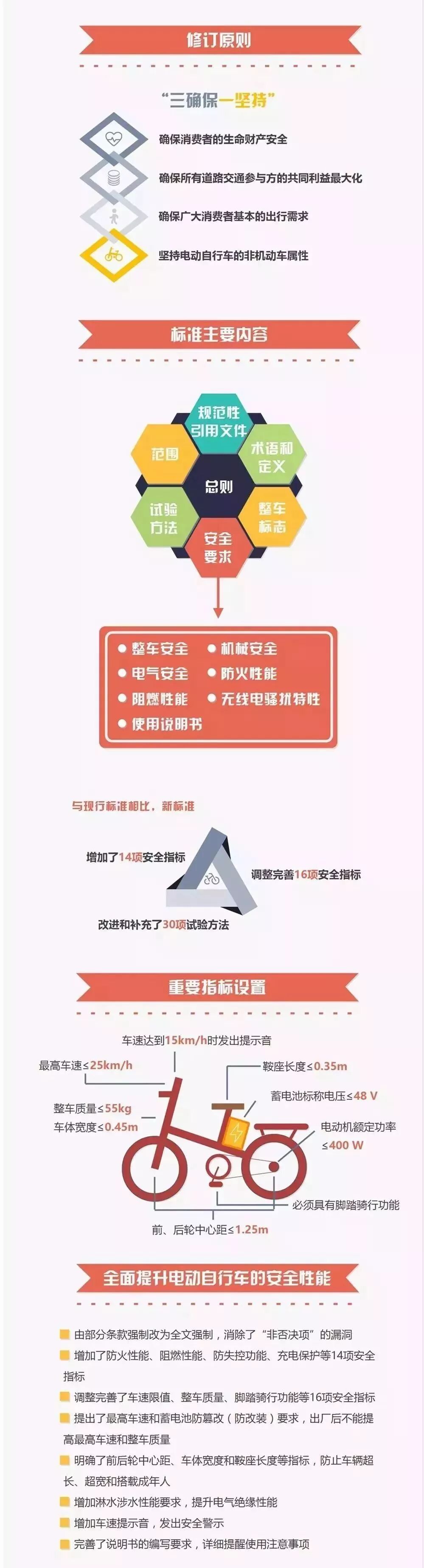 1月16日,工信部、公安部等公布新修订的《电动自行车安全技术规范》(报批稿),新标准全面提升了电动自行车的安全性能,由原来的部分条款强制改为全文强制,增加了防篡改、防火性能、阻燃性能、充电器保护等技术指标,调整完善了车速限值、整车质量、脚踏骑行能力等技术指标。